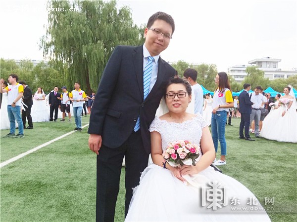 在集体婚礼的人群中,一位坐着轮椅的新娘让人印象深刻,新郎站在旁边温柔的看着自己美丽的妻子。“那时候,我想考哈工程,但是没有考上,一次偶然的机会在网上与丈夫认识,得知他是哈工程的毕业生以后心里很高兴,经常会问他关于学校的事情,慢慢的产生了感情”新娘刘俊颐微笑着说:“我小时候得了一场病,之后便只能坐轮椅行动,但是爱人并没有因此放弃与我来往,我们是2012年9月17日第一次相约见面,那时就一见钟情。”都说异地恋很难,新郎家乡在江苏无锡,而新娘在大庆市,为了经常见面,新郎每周都去大庆市看她,4年下来,积攒的火车票将近400张,这些车票如今成了爱情的见证。两人将在今年完婚,迎接他们幸福的生活。