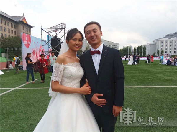 2015级在读博士王艺鹏和2014级硕士张谕都是哈尔滨工程大学的学生,特意参加了校庆集体婚礼。“我们班的男生有20人,女生10个人。因为都喜欢吃面,我俩常常一起去吃饭,性格也很合拍,有空就帮她补习功课。2012年11月11日光棍节是我俩正式脱单的日子,从那时开始她吃剩下的饭菜我都会帮她吃光。”新郎王艺鹏笑着说。夫妻俩都比较善谈,新郎是硕博连读,明年也要毕业。在哈工程学习生活多年,他和妻子都希望在这里留下更多美好的回忆。