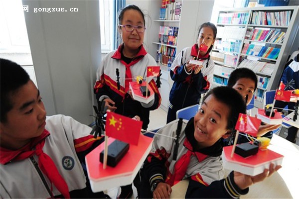共建启动仪式结束后,科普流动展厅“走近深蓝”开展,展览分为“海军历史—从无到有,往昔峥嵘;海军装备—大国利刃,闪耀东方;海军科研人物—风流人物,还看今朝”三个部分,较为全面展示了我国海军及海军装备发展的历史。展览结束后,“春雨教育科普扶智计划”讲师团成员为六年一班、六年二班的学生上了一堂精彩的“船舶浮力”的科普课程,并于同学们一起动手制作了双桨船。看到自己亲手制作的双桨船在水中航行,孩子们脸上露出了开心的笑容。