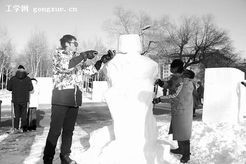 哈尔滨工程大学学子以“环保”为创作主题,正在制作雪雕作品《有用无用》。
