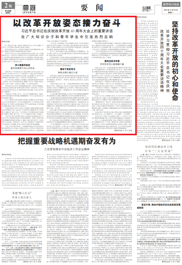 习近平总书记18日在庆祝改革开放40周年大会上的重要讲话,在广大知识分子和青年学生中引发热烈反响。大家表示,要不断丰富和发展改革开放40年积累的宝贵经验,顺应历史潮流,把握发展大势,奋发有为,锐意进取,以改革开放的姿态接力奋斗,开创美好未来。