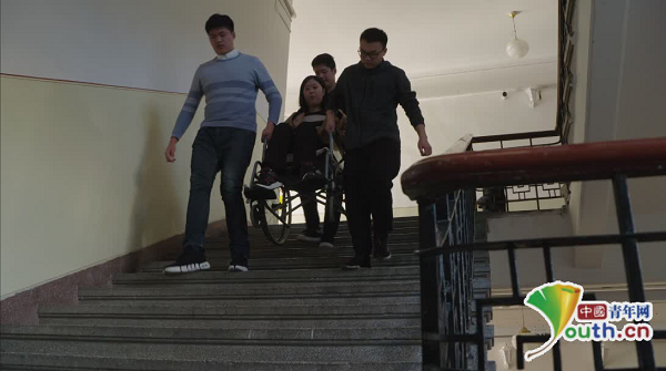 更令一家人感动的是,每次上课都有同学准时在教室门口等着她,将她从教学楼门口抬到教室。