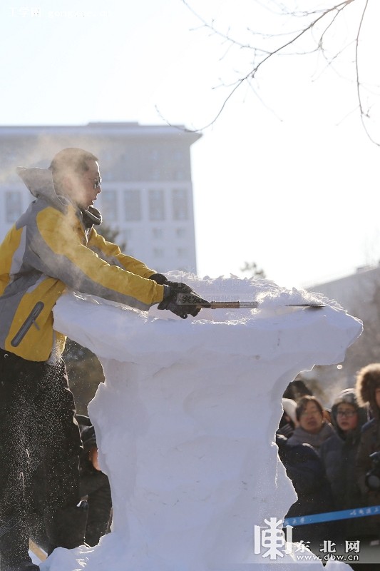 经组委会初步评选,30件作品进入决赛。在开幕式现场,由哈工程“雪雕工作室”的“雪雕达人”们进行20分钟的雪雕快雕表演,在20分钟时间内,将雪块打造成精美的雕塑作品,尽显雪雕活动的魅力。