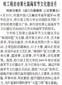 科技日报讯 (通讯员唐晓伟 记者李丽云)4月23日,时值中国人民解放军海军建军66周年纪念日,哈尔滨工程大学全体国防生列队于学校的奥列霍夫广场,举行该校第七届海军节文化建设月启动仪式并庆祝海军节的到来。