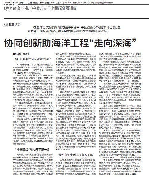 两年前,哈尔滨工程大学联合国内船海领域最高水平的企业和高校院所成立“深海工程与高技术船舶协同创新中心”。面向深海工程装备、高技术船舶、共性前沿技术三大创新任务,提升服务海洋强国战略需求的能力。该中心和中集来福士探索了有组织、有分工、有动力机制的深度融合。这种上有国家战略需求、下有业界发展需求、中有动力机制驱动的多边协同产生的效果很快得以体现。