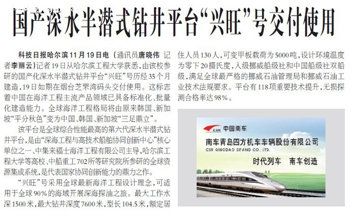 科技日报哈尔滨11月19日电 (通讯员唐晓伟 记者李丽云)记者19日从哈尔滨工程大学获悉,由该校参研的国产化深水半潜式钻井平台“兴旺”号历经35个月建造,19日如期在烟台芝罘湾码头交付使用。这标志着中国在海洋工程主流产品领域已具备标准化、批量化建造能力。全球海洋工程格局将由原来韩国、新加坡“平分秋色”变为中国、韩国、新加坡“三足鼎立”。