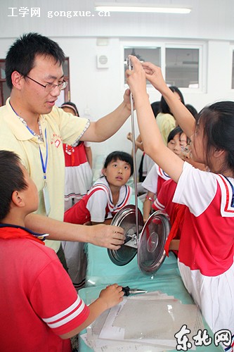 哈尔滨工程大学的志愿者教授小学生们如何做无碳小车。东北网记者 王蕊 摄