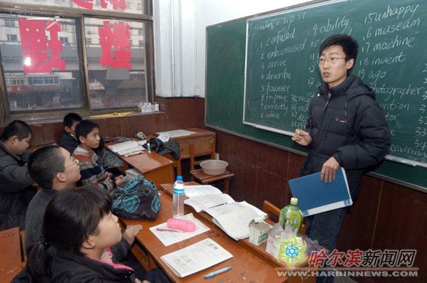 哈尔滨工程大学电子信息专业大四学生王学辉在名师文化学校做英语助教,给孩子们试讲