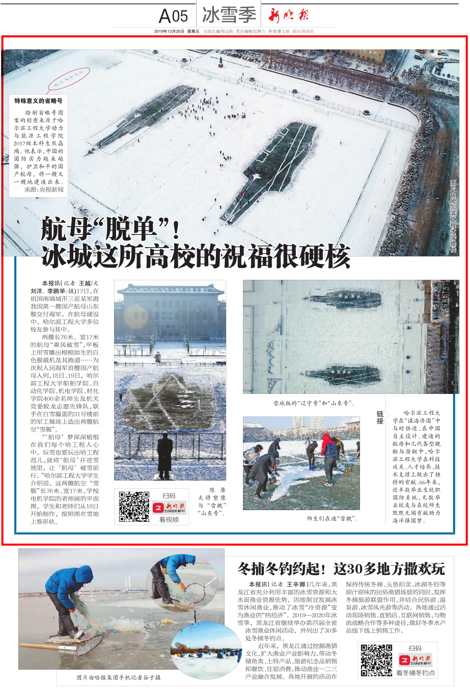 两艘长76米、宽17米的航母“乘风破雪”,甲板上用雪雕出栩栩如生的白色舰载机及其跑道……为庆祝人民海军首艘国产航母入列,18日、19日,哈尔滨工程大学船舶学院、自动化学院、机电学院、材化学院400余名师生及机关党委蛟龙志愿先锋队,联手在白雪覆盖的31号楼前的军工操场上造出两艘航空“雪舰”。