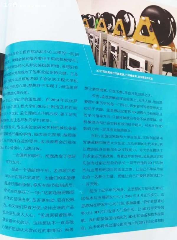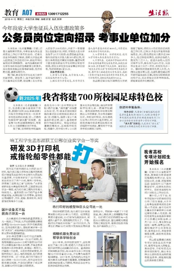 4月10日,《生活报》教育版运用半版篇幅以《哈工程学生孟思源获工信部创业奖学金一等奖——研发3D打印机戒指轮船零件都能打》为题转发此文。
