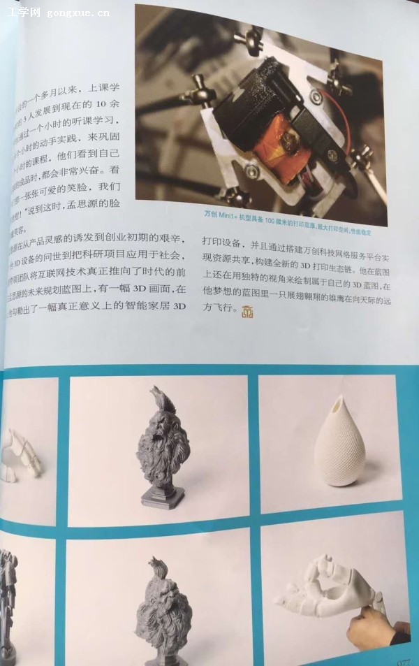 但是他越是打拼,越是坚定了自己的方向,他说:“创新能钻地穴,创业我就打拼到青天。”他抓住每次高校间交流和比赛的机会,不厌其烦的给人讲解,总结经验教训,为了把技术推广出去,把市场做开,他还走出校门,到中、小学校去免费推广,在这个过程中,他认识到有一套系统的教材的重要性,于是又开始自主编写了一套《3D打印与科技创新》系列课程,现该课程已被多家中、小学校认定为创新指定课程。