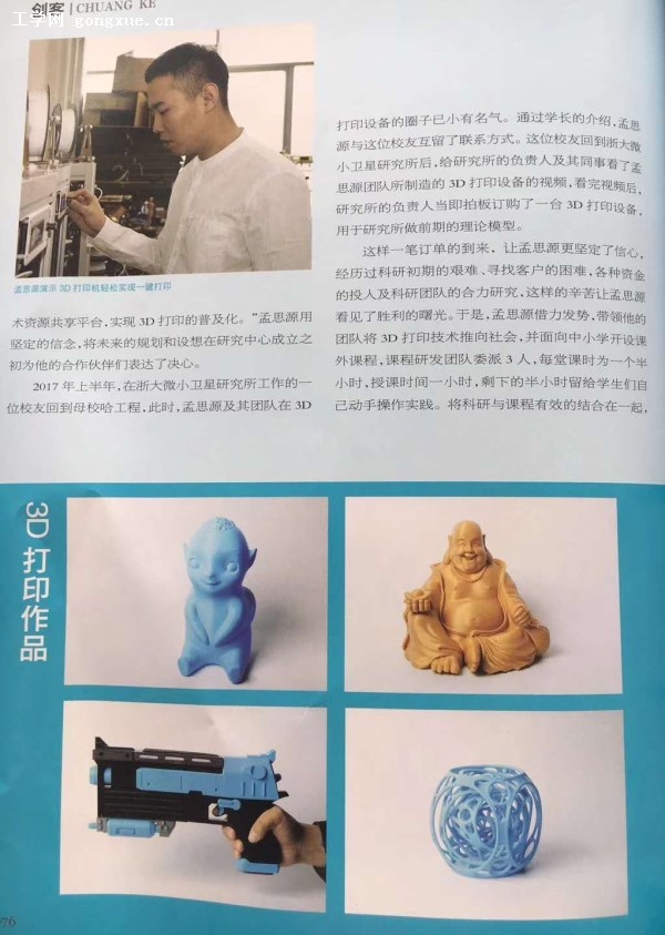 哈尔滨工程大学机电学院机械设计制造及其自动化专业本科生孟思源,完整经历并跨越了所有创业者都要必经的三个难关,最后实现了3D打印创业梦,创立了哈尔滨万创科技发展有限公司,任公司副总经理,同时创立哈尔滨妙观科技发展有限公司,任执行总监。曾获2016年“创青春”全国大学生创新创业大赛银奖、工信部创业奖一等奖学金等国家级、省级双创奖项十余项。曾参加CCTV10“寻找科学达人”栏目、黑龙江卫视“王牌创客营”栏目,获多家媒体报道。