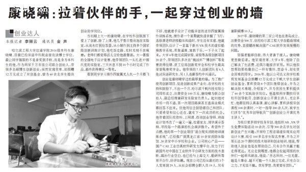 6月11日《科技日报》第六版以《康晓啸:拉着伙伴的手,一起穿过创业的墙》为题进行报道。