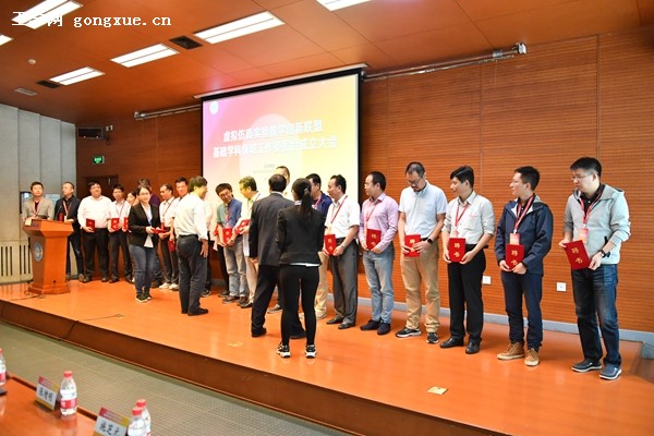 虚拟仿真实验教学创新联盟执行秘书长王宏宇宣读联盟基础学科领域工作委员会成员,在场领导为工作委员会成员颁发聘书。