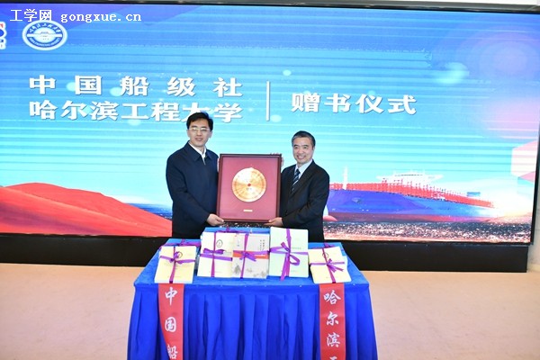 开幕式上,莫鉴辉代表中国船级社向学校赠送光盘和图书,高岩代表学校接受赠送。