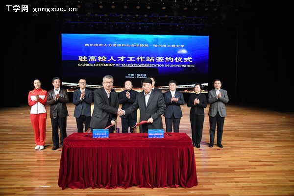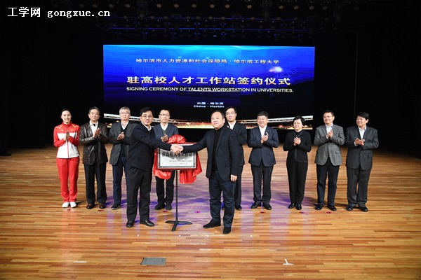 活动中播放了哈尔滨市人才政策宣传片《选择•成就非凡》。宣讲会现场,市人社局与哈尔滨工程大学签订“驻高校人才工作站合作协议书”,并举行人才工作站揭牌仪式。