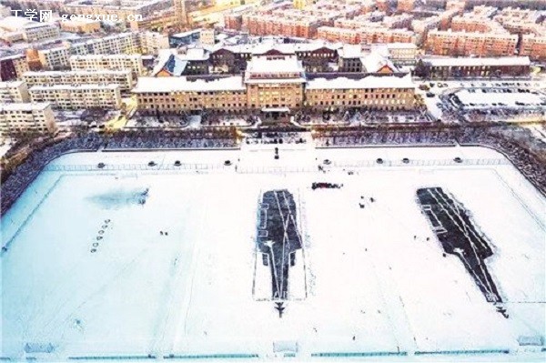 12月19日,为庆祝首艘国产航母入列,来自船舶学院、自动化学院、机电学院、材化学院的400余名师生及校学生会、机关党委蛟龙志愿先锋队再次出动,在白雪覆盖的军工操场“造”出两艘航空“雪舰”。