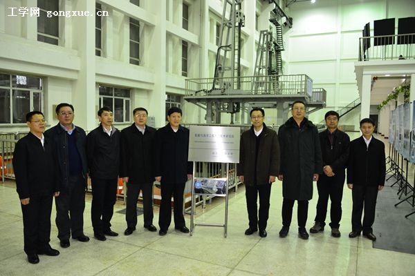 金书波一行与校领导在学校船舶与海洋工程先进技术研究院牌匾前合影