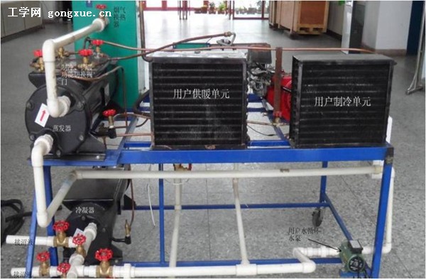 基于热泵系统的供热供冷装置由沼气机热泵回路、用户系统回路、太阳能沼气池供应回路和沼气机余热余质综合利用回路构成。其基本工作流程为:冬季,沼气经过净化后,作为沼气机的燃料,驱动整个热泵系统工作,将热量传递给用户供暖水,达到冬季供暖的目的;太阳能集热器保证冬季沼气池的产气温。夏季,利用四通转向阀使制冷剂流向转变,沼气机驱动热泵工作时,则将冷量传递给用户,实现夏季制冷目的。过渡季节,利用安装在沼气机上的盘式发电机实现电量的供应;全年将沼气机的尾气排向温室大棚,从而实现沼气机尾气的余质回收。