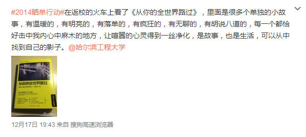 @芦苇丛里的东东:在返校的火车上看了《从你的全世界路过》,里面是很多个单独的小故事,有温暖的、明亮的、落单的、疯狂的、无聊的,每一个都恰好击中我内心中麻木的地方,让喧嚣的心灵得到一丝净化,是故事,也是生活,可以从中找到自己的影子。