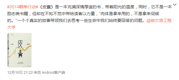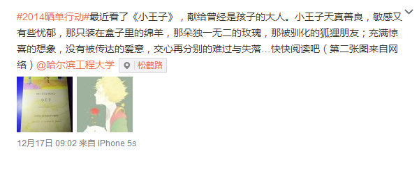 近年来,党中央高度重视学习,相继做出打造学习型政党、建设学习型社会、学习型党组织的重大战略部署,号召全党全社会多读书、读好书。“我爱好挺多,最大的爱好是读书,读书已成为我的一种生活方式。”国家主席习近平曾在接受巴西《经济价值报》记者采访时这样说。早在上半年访问法国并演讲时,就曾高调“晒”书单,随口提到的不少书籍,几乎囊括所有法兰西文豪、思想家。我校学习型党组织建设也将“读书计划”列为一项重要内容。“晒”书单不是炫耀自己读了多少书,而是借“晒”总结所获、交流感悟。我们请图书馆向读者“晒晒”2014借阅排行榜,请借阅最高的师生谈读书感悟,请院系读书协会、职工读书联盟、本报老读者、基层党支部书记等共话读书心得,并以微活动的形式征集师生读书热话。“晒”出的书单或是专业书籍、科技期刊,或是经典名著、人文读物。这些书籍或给人思想的启迪,或给人知识的滋养,或让人身心愉悦、余香萦绕、回味悠远。