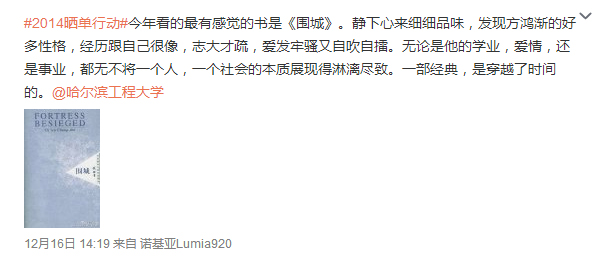@小小:今年看的最有感觉的书是《围城》。静下心来细细品味,发现方鸿渐的好多性格特点,志大才疏,爱发牢骚又自吹自擂。无论是他的学业、爱情、还是事业,无不将一个人,一个社会的本质展现得淋漓尽致。一部经典,是穿越了时间的。