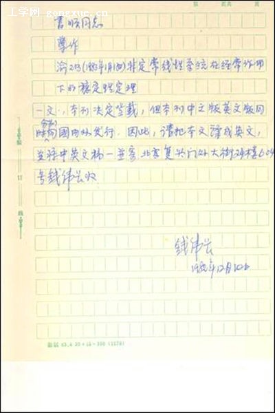 我决定选择“非定常系统”和“经常干扰条件”这一当时较少人关注的研究领域,边学习边教学,于1982年编写了教材《系统运动稳定性理论》三册,共计25万字,并撰写论文《非定常线性系统在经常作用干扰下稳定性定理》。1983年,向由著名科学家钱伟长教授主编的国际性刊物《应用数学和力学》投稿。没想到在1984年就收到了由钱伟长教授亲自写的回信,信中写道:“《非定常线性系统在经常作用下的稳定性定理》一文,本刊决定登载,但本刊中文版英文版同时分别向国内外发行,因此,请把本文译成英文,并将中英文稿一并寄北京复兴门外大街24楼604号钱伟长收。”这篇论文在1986年发表后,更进一步坚定了我的信心,要沿着这个方向继续研究下去。