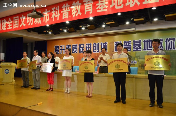 与会领导为哈市科普教育基地、优秀科普志愿服务队代表授牌。