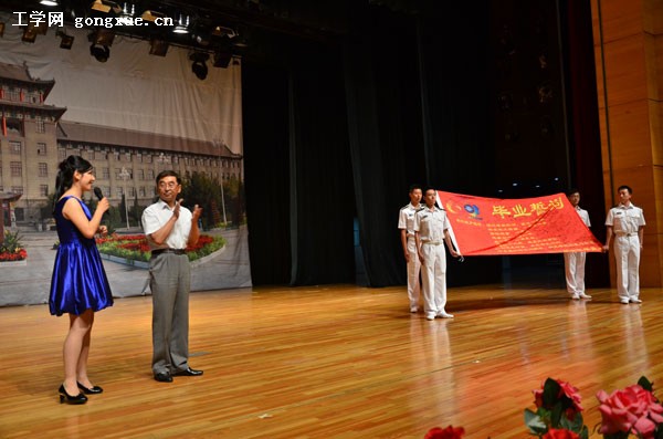 颁奖典礼上,全体校优秀毕业生献给母校一份有特殊意义的礼物——全体2013届毕业生在陈赓院长铜像前郑重宣誓的毕业誓言旗帜,旗帜上是全体获奖同学的亲笔签名。
