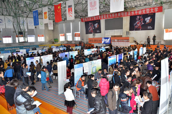 目前,我校已为2013届毕业生召开了300余场专场招聘会,以及包括此次大型招聘会在内的两场双选会,目前研究生就业率与去年基本持平,本科生目前签约情况略低于去年。此外,招生就业处还采取到院系座谈、加强就业技巧和技能辅导、提供就业平台等措施加强对考研失利学生的就业指导。