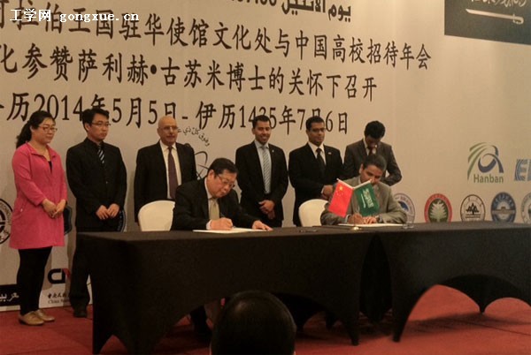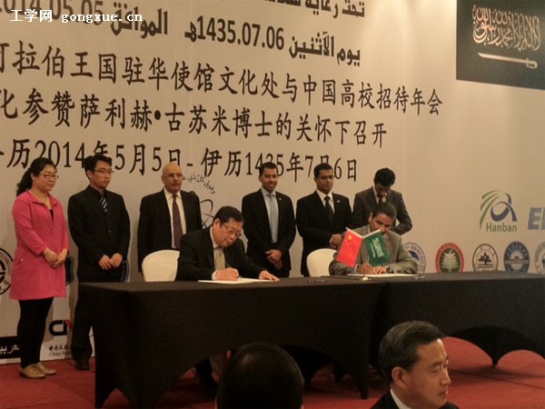 会上,杨德森代表学校与沙特阿拉伯王国驻华大使馆文化参赞萨利赫·古苏米博士签署了关于沙特留学生来华学习的教育合作协议。旨在加强并完善双方对沙特在华留学生日常管理,促进中沙的教育合作,协议的签署标志着我校成为沙特政府指定的培养院校。