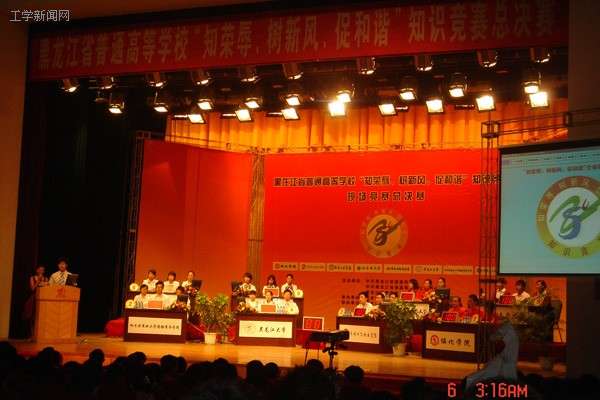 另有绥化学院、黑龙江大学、哈尔滨师范大学、佳木斯大学等七支代表队参加总决赛的角逐,比赛分必答题、抢答题、风险题等6个部分,整场决赛历时两个多小时,最终黑龙江大学以230分的总成绩获得一等奖,我校代表队屈居二等奖。据了解本次比赛的主旨是为深入贯彻落实党的十六届六中全会和省市党代会精神,进一步在全社会大力倡导以“八荣八耻”为主要内容的社会主义荣辱观,加强社会主义核心价值体系建设,提高大学生思想道德素质,以良好的精神风貌迎接2008年北京奥运会和2009年世界大学生冬季运动会的召开,促进社会和谐。