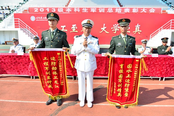 魏潾向65923和65947部队赠送锦旗,并代表学校向承训官兵和国防生教官表示衷心感谢,对同学们经过军训取得的进步表示祝贺,最后,他对全体新生提出了四点希望:一是希望把学习当成生活的乐趣,勤奋进取,全面成长;二是要培养团队合作精神,在合作中各自发挥所长;三是要正确面对困难,始终对自己充满自信;四是希望同学们继承发扬在军训期间养成的优良作风,用坚韧不拔的精神迎接大学生活。