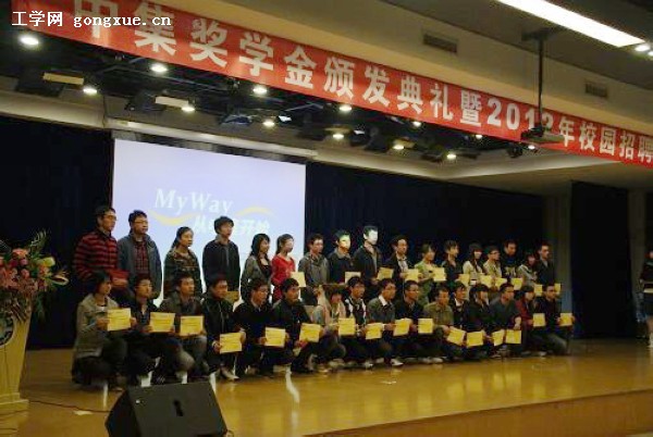 我校学生综合素质受到用人单位普遍好评,每年都有一批企业来校设立和颁发企业奖学金,图为中集集团奖学金颁发仪式。