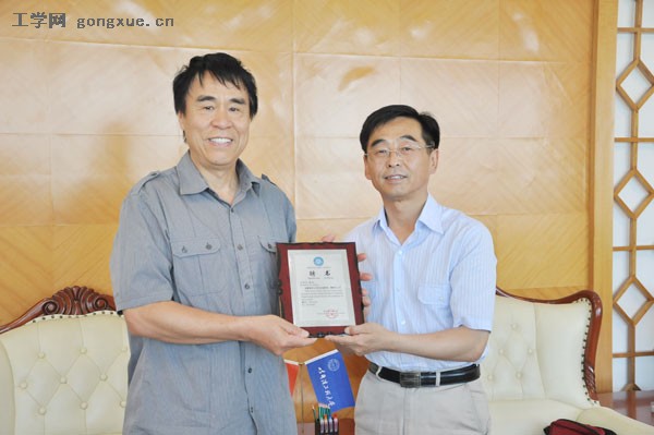 该剧剧本作者丁子江教授受聘成为我校客座教授。刘志刚向丁子江颁发了聘书并为他佩戴校徽。