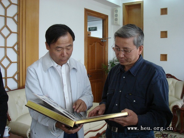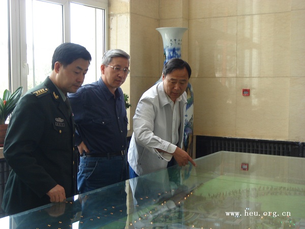 5月19日,哈军工陈赓院长之子陈知庶将军来学校访问。党委副书记、副校长魏潾向陈知庶将军介绍了校园规划沙盘和校园群雕《受命》的设计效果图。