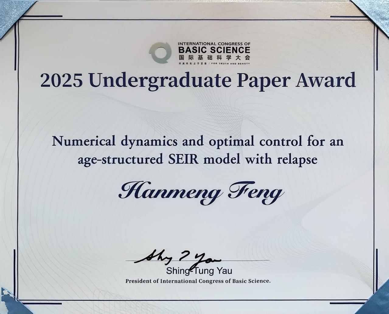 2024年首届评选中,来自清华大学、上海交通大学、美国康奈尔大学等国内外知名高校的10名学生获得这一荣誉;2025年,共有来自清华大学、中国科学技术大学、南开大学、复旦大学、哈尔滨工程大学等7名学生获得ICBS本科论文奖,我校数学科学学院薛玲教授主持的复杂网络与动力系统研究团队的冯含萌同学(团队指导教师:陈志杰)以其论文“Numerical Dynamics and Optimal Control for an age-structured SEIR modelwith relapse”获此殊荣。