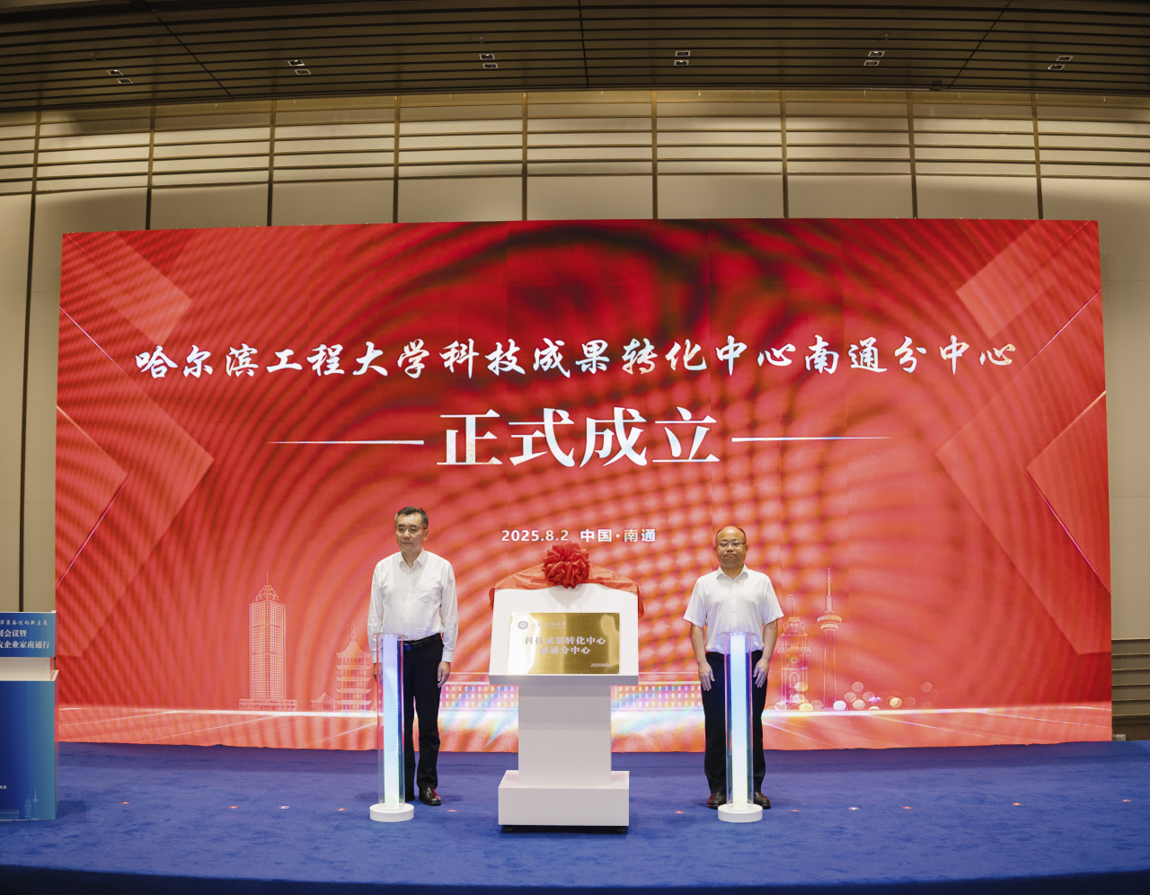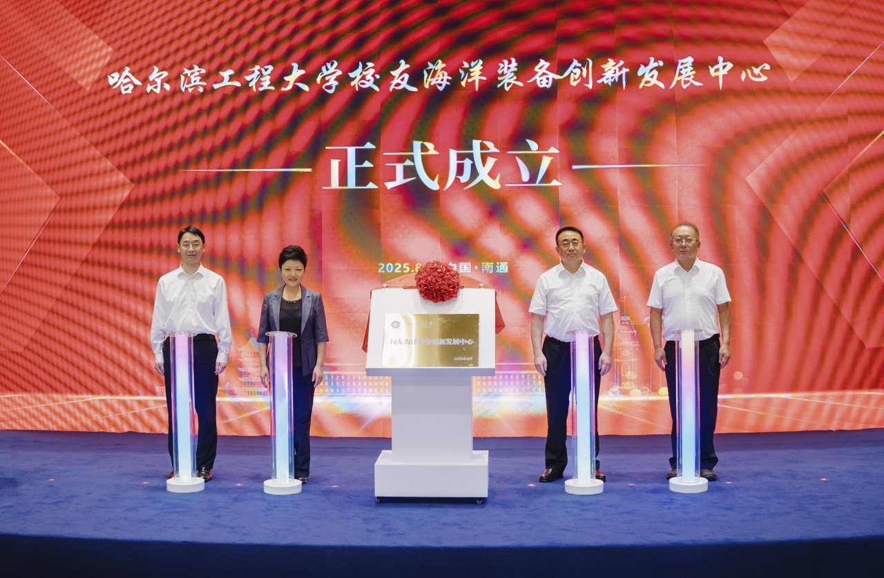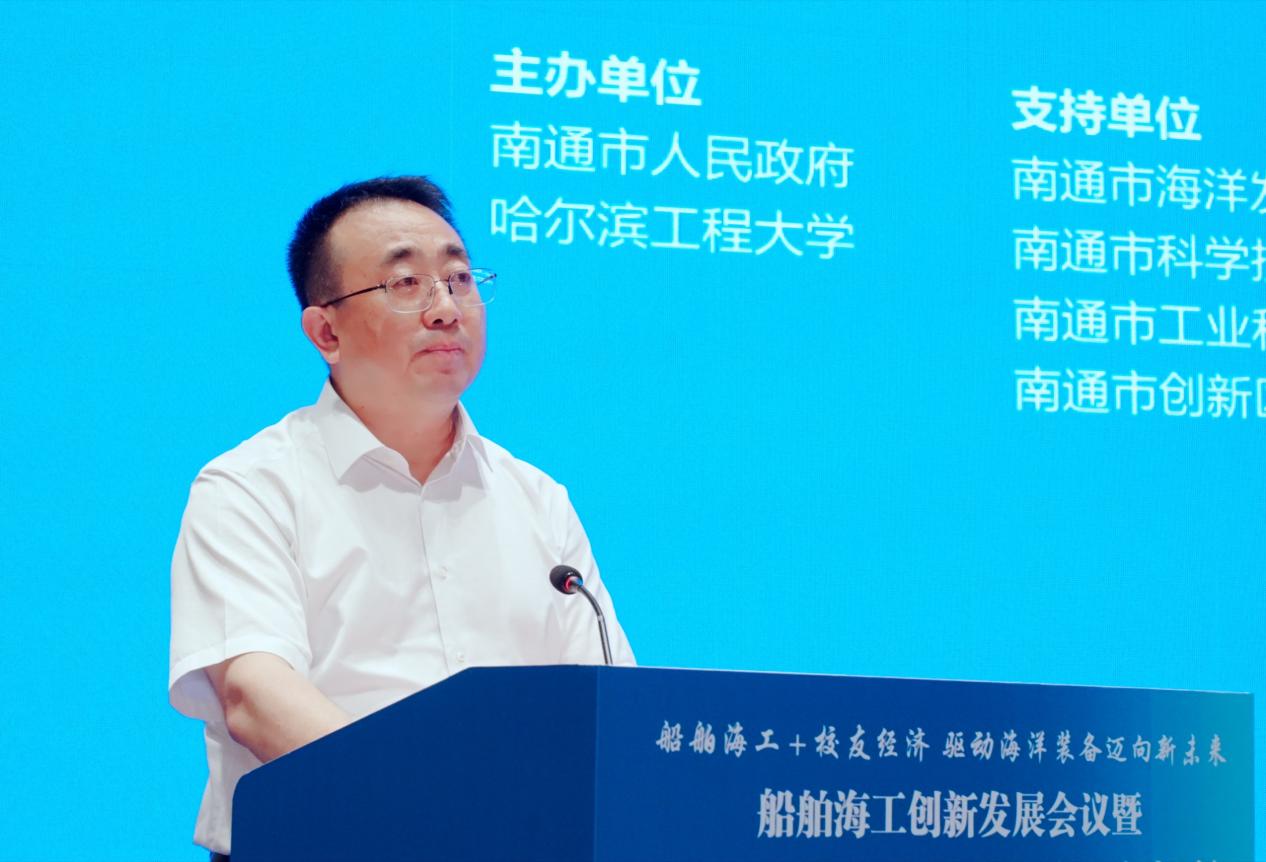 为贯彻落实习近平总书记关于海洋经济高质量发展的重要讲话精神,贯彻落实习近平总书记视察学校重要讲话重要指示精神,践行“五个坚持、五个注重”办学原则,发挥特色优势,积极拓展社会资源,深化产教融合,服务支撑海洋经济高质量发展,8月2日,船舶海工创新发展会议暨哈尔滨工程大学船海校友企业家南通行活动召开,“哈尔滨工程大学校友海洋装备创新发展中心”“哈尔滨工程大学科技成果转化中心南通分中心”揭牌成立。学校党委副书记、校长宋迎东出席会议并致辞。校党委常委、副校长韩端锋,校长助理陈海龙,南通市委副书记、市长张彤,南通市副市长熊俊、凌屹出席会议。
