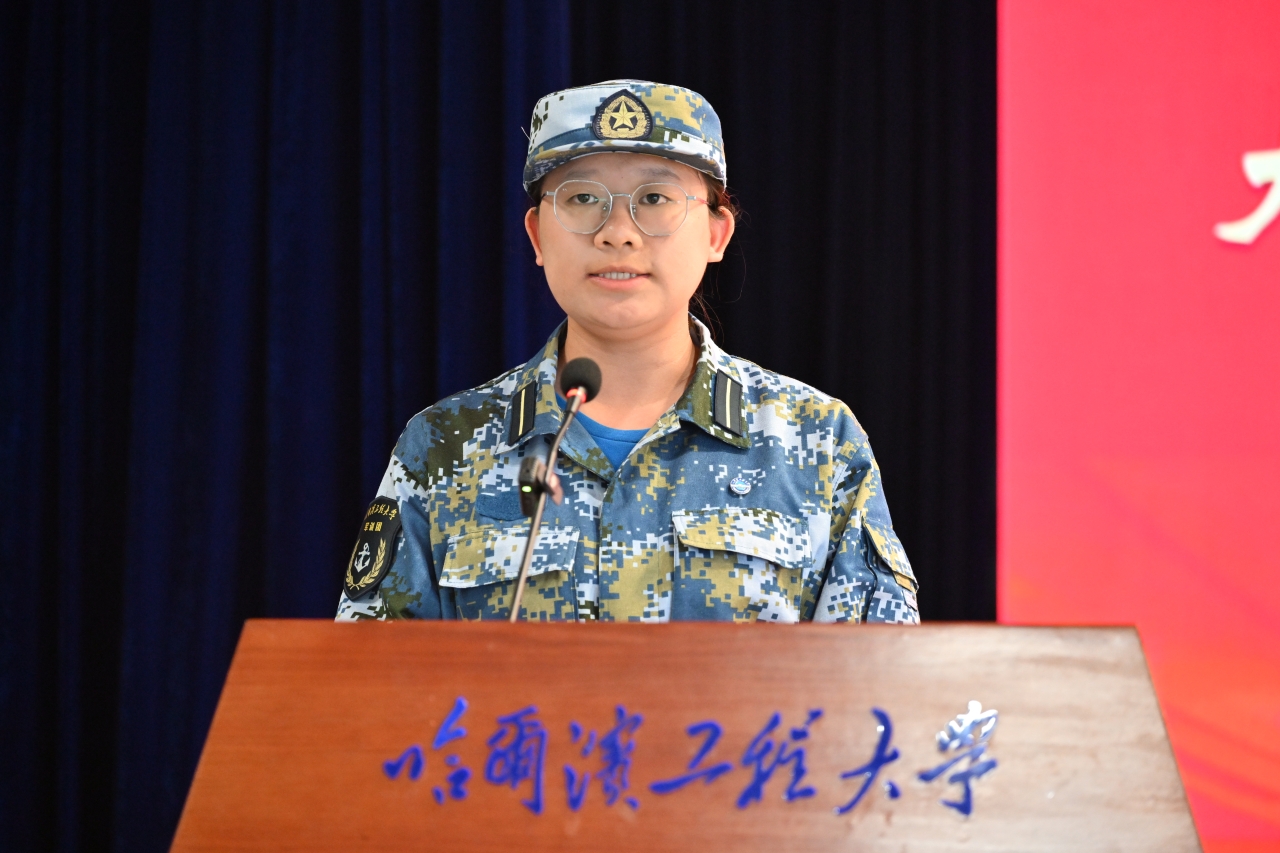 绿色智能船舶工程领军班的张雨鑫代表新生发言。她简要介绍了自步入大学以来的生活和收获,希望自己在兴海学院的平台成长为有情怀、有本领、有担当的人。她表示,将始终牢记习近平总书记殷切嘱托,在今后的学习科研中,以兴海报国热血点燃求知火种,用开拓创新思维丈量万里海疆。