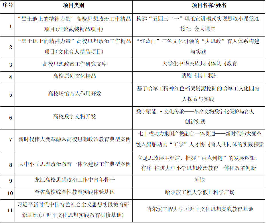 日前,黑龙江省教育厅公布了“黑土铸魂”高校思想政治工作质量提升综合改革与精品建设项目遴选结果,学校11个项目成功入选,涵盖理论武装、文化育人、研究文库、原创文化、场馆开发、数字文物、实践基地等多个类别。