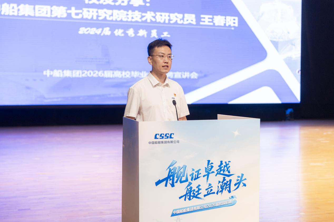 中船集团第七〇八研究所副总工程师、我国首艘大洋钻探船“梦想”号总设计师、1995级校友张海彬,第七研究院技术研究员、2013级校友王春阳作为校友代表分享了自己在中船集团的成长经历和工作体会。