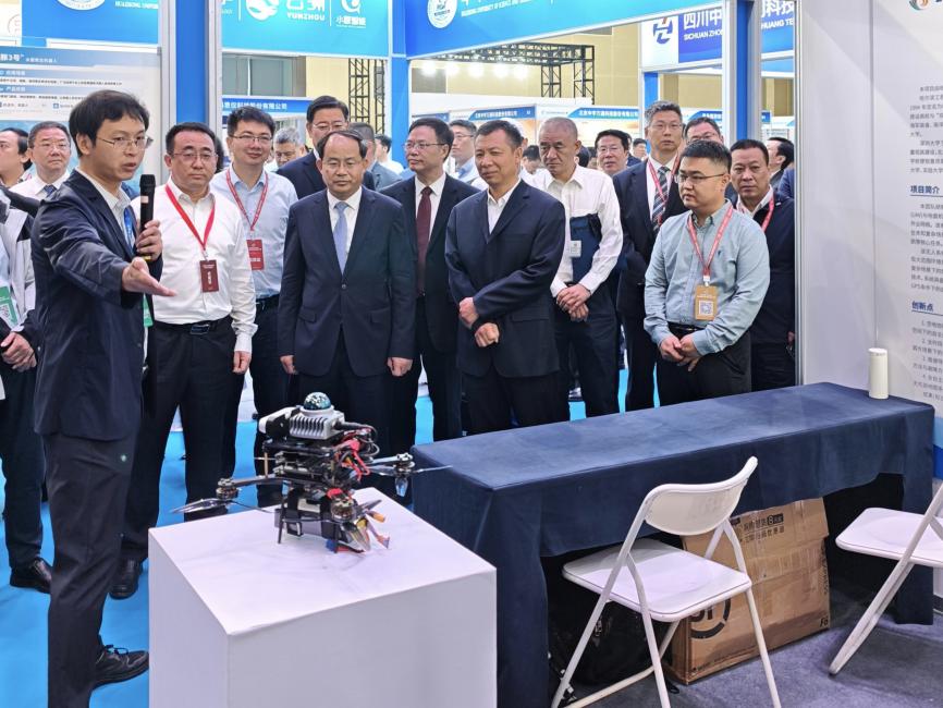 在决赛期间举办的创新成果展中,单忠德在我校展位详细了解师生项目创新点、技术路径及应用前景,并对学校新域新质创新工作给予肯定。