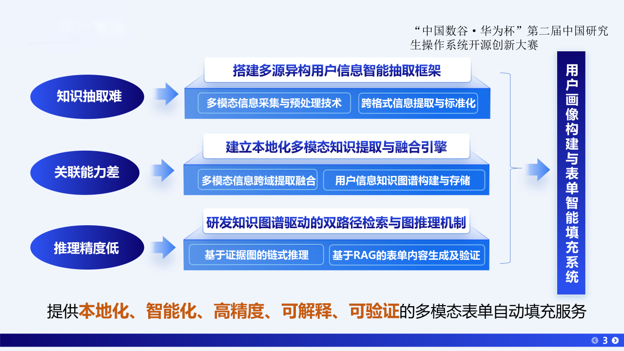 项目简介:该项目基于OpenKylin(“开放麒麟”)社区,创新提出“双域知识子图构建+双层检索增强生成”技术,融合操作系统中的内容与系统信息,实现从多源数据到用户画像的全链路处理。通过跨域信息对齐与图推理增强,显著提升复杂表单的智能填充精度与效率,为人机协同与操作系统认知能力升级提供了新思路。