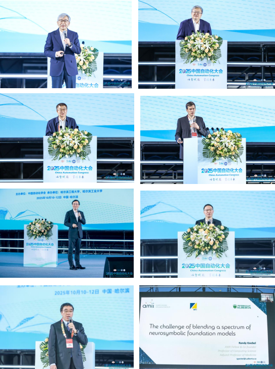 主旨报告环节,中国工程院院士,中国自动化学会会士、名誉理事长,西安交通大学教授郑南宁作题为《从概念生成到意图驱动的智能》的报告。中国工程院院士,中国自动化学会会士,中国科学院沈阳自动化研究所研究员于海斌作题为《人工智能时代的制造自动化》的报告。哈尔滨工程大学教授夏桂华作题为《船舶数字孪生技术研究及在无人船编队控制中的应用》的报告。菲尼克斯集团数字化业务首席技术专家Benjamin Homuth作题为《PLCnext Technology——新一代开放自动化控制平台》的报告。陈杰院士作题为《生物群体启发下的无人系统合作演化与群智涌现》的报告。中国工程院院士,中国自动化学会会士、特聘顾问,湖南大学教授王耀南作题为《具身智能机器人感知与控制前沿技术》的报告。和利时科技集团有限公司副总裁何春明作题为《破局与增效 人工智能重构工业控制系统》的报告。阿尔伯塔大学教授Randy Goebel线上作题为《混合多种神经符号基础模型的挑战》的报告。他们分享自动化领域最新研究成果,深入探讨行业发展趋势与创新路径,带来思想与智慧的学术盛宴。