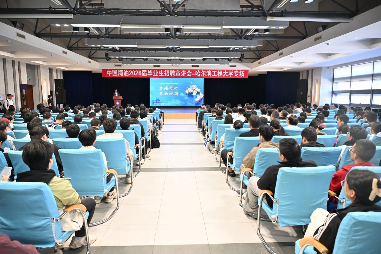 10月12日,中国海洋石油集团2026届校园招聘哈尔滨工程大学专场宣讲会在启航活动中心多功能厅举行,中国海洋石油集团下属10家单位40余名招聘代表来校招聘。校党委副书记、校长殷敬伟,海洋石油工程股份有限公司董事长、党委书记王章领,校长助理陈海龙出席宣讲会。