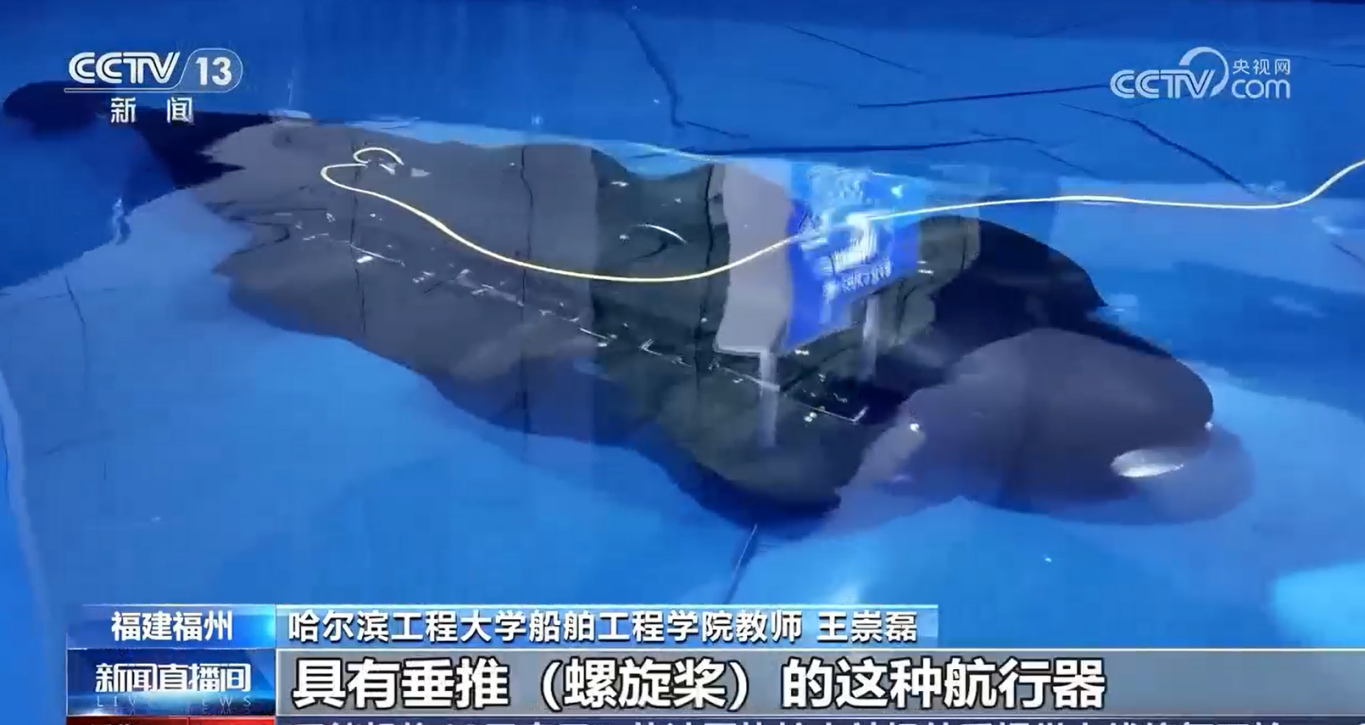 在3号馆主宾展区,很多观众被一个大水池吸引。走近一看,池子里竟有一条黑色的“鲨鱼”在游弋,这正是哈工程船舶工程学院郭春雨教授团队研发的波动耦合泵喷式仿生航行器。