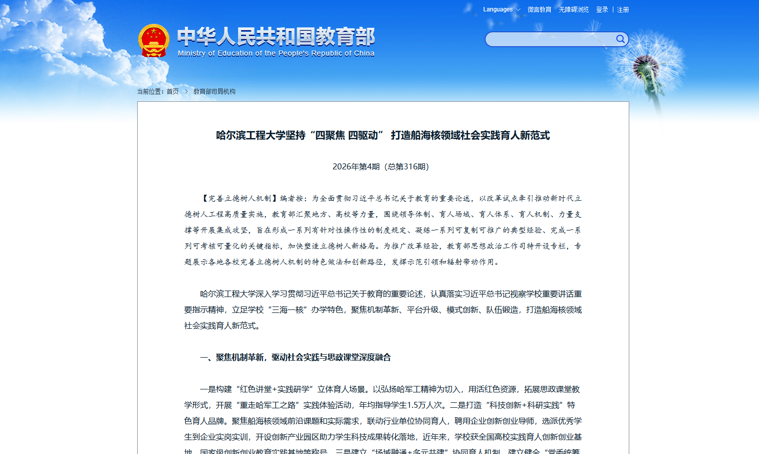 1月21日,教育部官网以《哈尔滨工程大学坚持“四聚焦 四驱动” 打造船海核领域社会实践育人新范式》为题,报道了我校立足学校“三海一核”办学特色,聚焦机制革新、平台升级、模式创新、队伍锻造,打造船海核领域社会实践育人新范式的特色做法。全文如下: