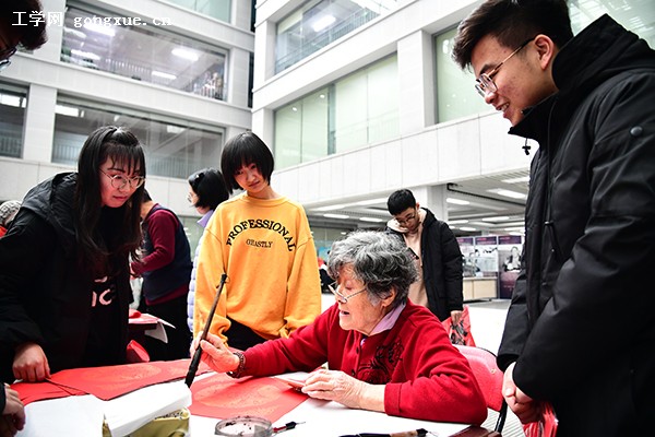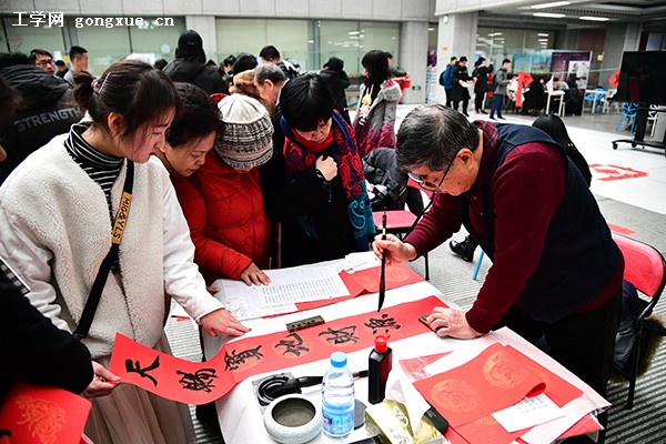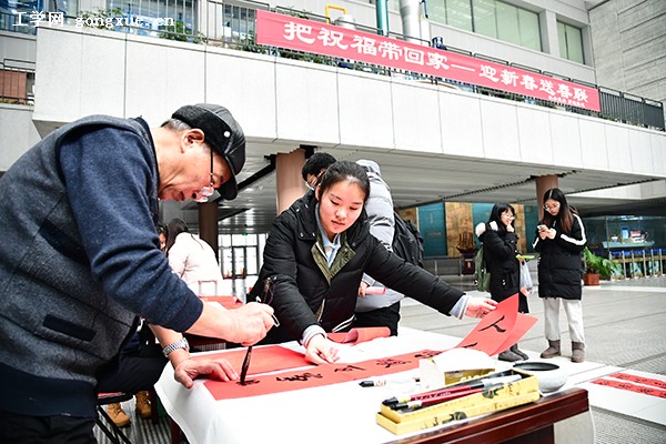 “人和家顺百事兴,富贵平安福满堂”“天赐宝地财源广,地助富门吉祥家”一副副对联、一张张“福”字,字体刚劲,笔法娴熟,寄托了对广大师生、对祖国的深情祝福,吸引了众多师生驻足观看、排队领取。