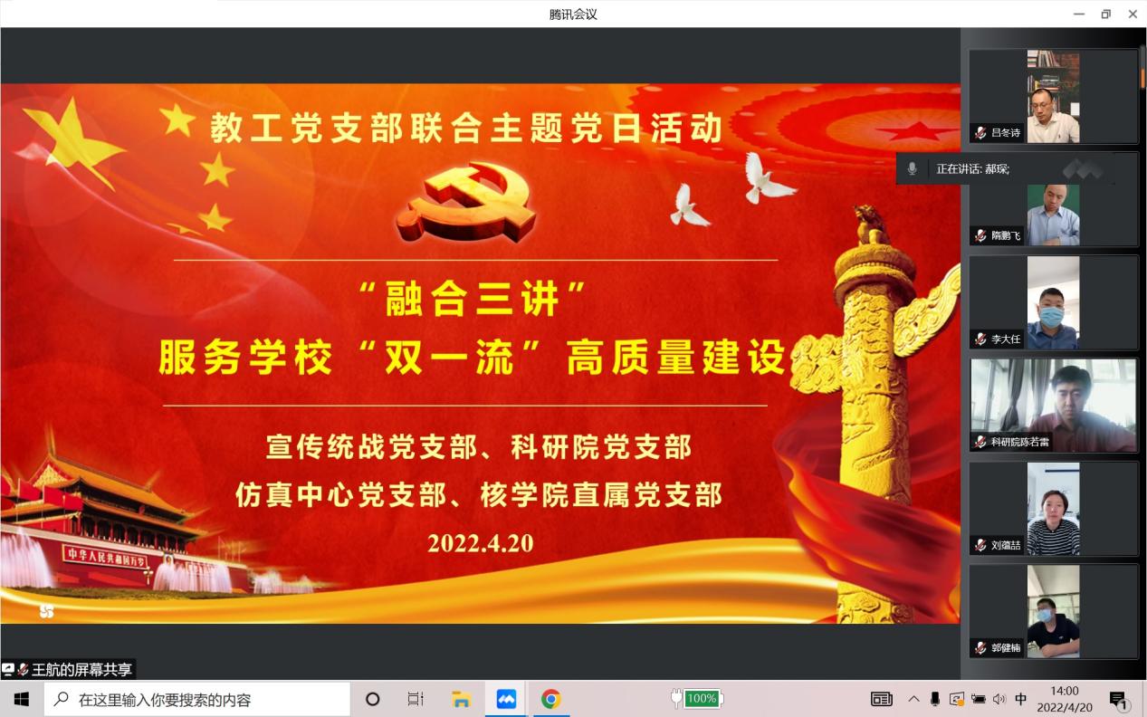 为落实学校教工党支部“对标争先”行动计划要求,推动党建与业务工作深度融合,4月20日,学校宣传统战党支部、科研院党支部、核学院仿真中心党支部和核学院直属党支部以“融合三讲”活动为牵引,线上联合开展“‘融合三讲’服务学校‘双一流’高质量建设”主题党日活动。核学院常务副院长、仿真中心党员教师代表赵强讲述...