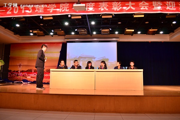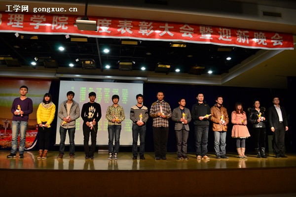 2012-2013学年度理学院校级荣誉、院级荣誉的表彰活动穿插整个晚会过程中,获奖学生依次上台领奖,理学院有关领导为他们颁发获奖证书和礼品,并与他们合影留念。